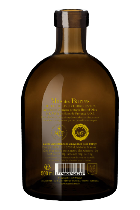 Récoltée précocement, c’est l’huile typique de l’appellation Vallée des Baux de Provence. Elle est composée d’un assemblage de plusieurs variétés (comme le veut l’appellation) dont principalement la Salonenque et la Béruguette (également connue sous le nom d’Aglandau) et en quantité moindre de Verdale des Bouches du Rhône et de Grossane. Le fruité vert est une huile corsée caractérisée par son ardence. La Béruguette lui apporte son ardence et des arômes d’artichauts et d’amandes, tandis que la Salonenque plus douce apporte des arômes d’artichauts et de noisettes. Le fruité vert est idéal pour la cuisson.